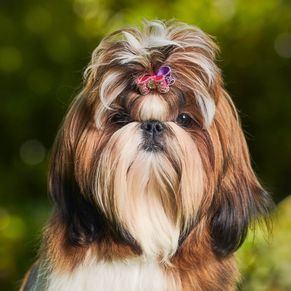 Shih tzuèn kaldes også for krysantemum hunden, idet hårende på hovedet vokser i alle retninger og i modsætning til Ihasa apsoèn ofte bæres opsat med elastik